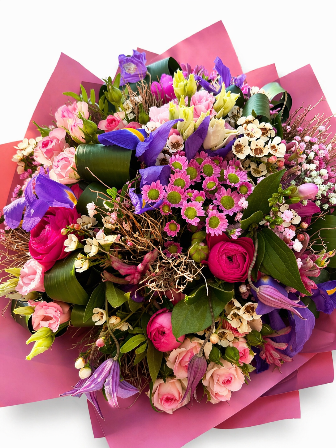 Táto bohatá a pestrá kytica je ideálnou voľbou pre slávnostné príležitosti, gratulácie alebo len tak pre radosť. Dominuje jej harmonická kombinácia ružových a fialových odtieňov s jemnými bielymi akcentmi, zabalená v elegantnom tmavoružovom dekoračnom papieri.