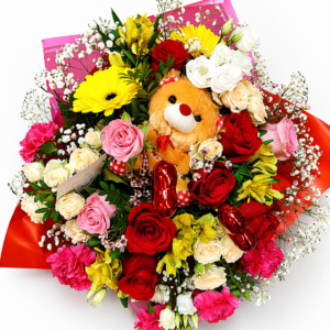 3 ks gerber,3 ks karafiátov, 2 ks alstromerií,2 ks chryzantém doplnené zeleňou.