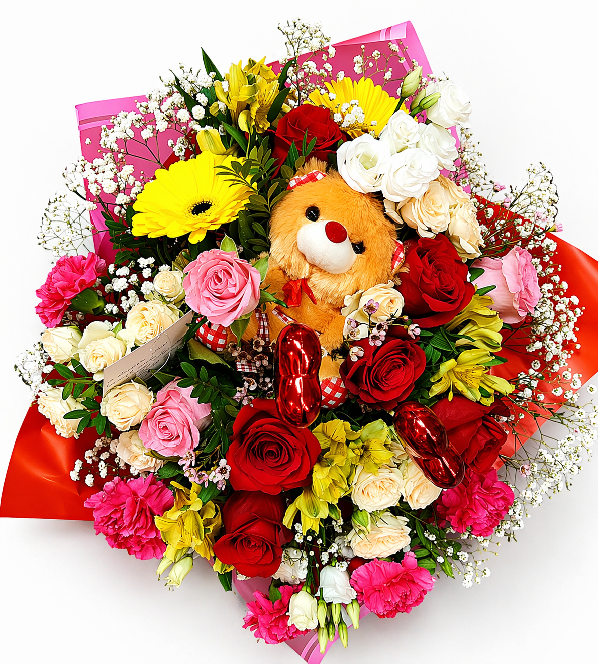 plyšový macík ,gerbery ,hrachory ,karafiáty, chryzantémy doplnené zeleňou.