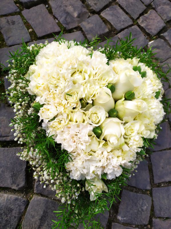 Zloženie: 8 ks bielych ruží,40 ks bielych karafiátov doplnené zeleňou.